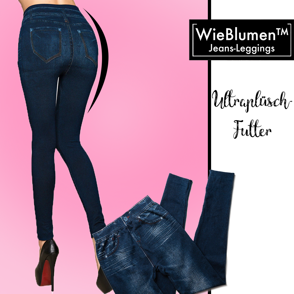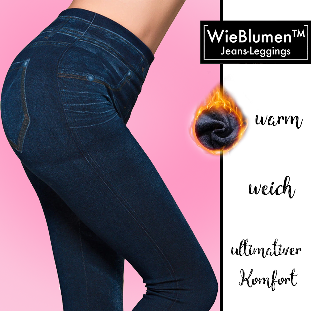 Stylish with function! These are the new leggings in a denim look from WieBlumen. The ultra-comfortable pants showcase your figure to perfection. The faux-jeans structure with a used look slims the buttocks, thighs, and hips. The wide comfort waistband provides additional support and compression.